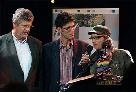 Foto: De makers van het ‘Theater van het sentiment’ Stefan Stasse en Marc Stakenburg krijgen de radioring van Willem van Kooten met op de achtergrond Hans Schiffers.