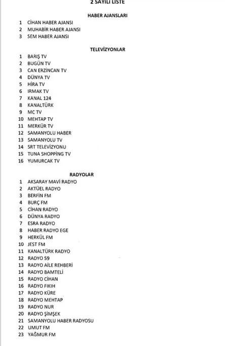 Ook heeft Erdogan 16 televisiezenders en 23 radiozenders op zwart gezet. Ze brachten volgens Erdogan kritisch berichten over het bewind. Ze zouden aanhangers van de Gülen-beweging zijn en volgens de Turkse regering steunen zij allen de mislukte coup. [Radiowereld.NL]