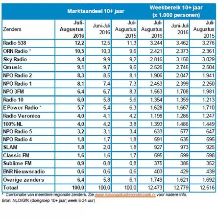 De luistercijfers van het Nationaal Luister Onderzoek over de periode juli – augustus 2016 zijn dinsdag bekendgemaakt door Stichting Nationaal Luister Onderzoek (NLO), de opdrachtgever van het luisteronderzoek. Radio 538 staat ook in deze periode met 12.2% wederom op de 1ste plaats.