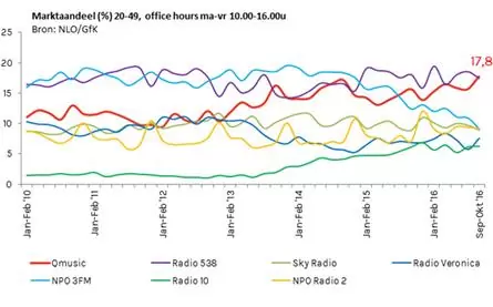 Binnen de doelgroep 20-49 jaar is Qmusic met een marktaandeel van 17.8 procent marktleider in de ‘office hours’. Qmusic is hiermee de best beluisterde zender van Nederland tussen 10.00 en 16.00 uur.