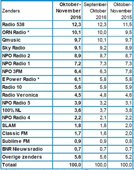 – Gelijk: Radio 538, Slam, Sublime FM, BNR Nieuwsradio, Overige zenders.