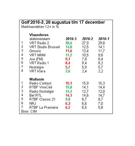 Studio Brussel heeft de tweede plaats heroverd. De alternatieve jongerenzender van de VRT zag haar marktaandeel met een half procentpunt stijgen naar 13%. Bij Qmusic was er minder reden voor blije gezichten, want het station zag haar winst van de voorgaande periode als sneeuw voor de zon verdwijnen. Q staat nu op de derde plaats met 11,6%. Het station voelt echter de hete adem van rivaal MNM van de VRT.