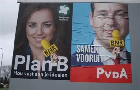 BNR heeft de verkiezingen aangegrepen voor een sterk staaltje Guerrillamarketing. Over de verkiezingsposters van verschillende partijen zijn onder de neus van de lijsttrekkers stickers met de bekende gele microfoon van BNR geplakt.