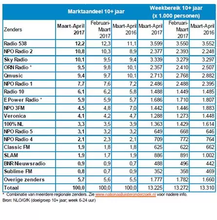 De luistercijfers van het Nationaal Luister Onderzoek over de periode maart – april 2017 zijn dinsdag bekendgemaakt door Stichting Nationaal Luister Onderzoek (NLO), de opdrachtgever van het luisteronderzoek. Radio 538 staat in deze periode met 12.2% op de 1ste plaats.