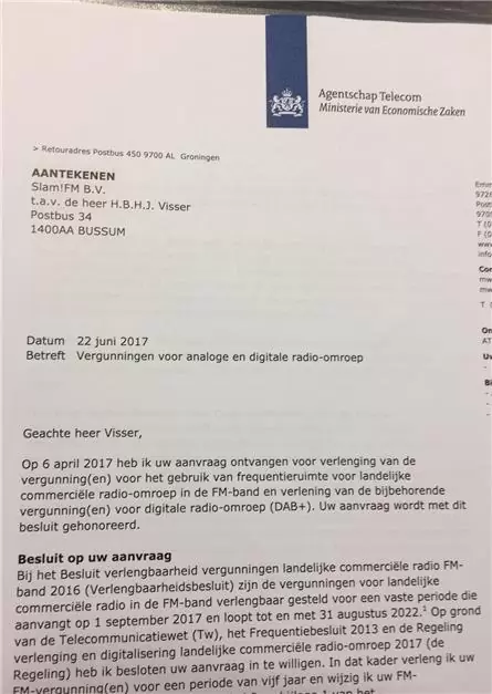 De eerste landelijke commerciële radiostations hebben bericht gekregen van het Agentschap Telecom (AT) dat hun FM-vergunning met vijf jaar verlengd is. Onder meer bij 100% NL en Slam werd de nieuwe vergunning vrijdag bezorgd.
