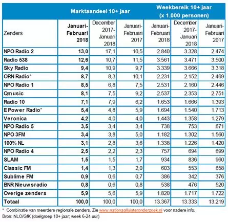 De luistercijfers van het Nationaal Luister Onderzoek over de periode januari – februari 2018 zijn dinsdag bekendgemaakt door Stichting Nationaal Luister Onderzoek (NLO), de opdrachtgever van het luisteronderzoek. Radio 2 staat in deze periode met 13.0% op de 1ste plek.