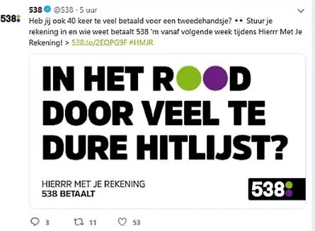 Op social media heeft Radio 538 rivaal Qmusic op de hak genomen in de promotie voor de jaarlijkse actie “Hierrr met je rekening”. 538 Wilde de Top 40 niet meer, omdat de lijst teveel geld vroeg, waarna Qmusic ermee vandoor ging. Op twitter verscheen de tekst “In het rood door veel te dure hitlijst?”. [Radiowereld.NL]