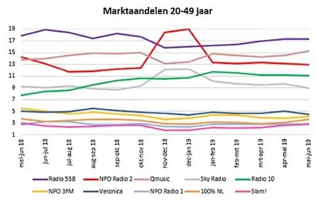 Opvallend is dat NPO Radio 2 maar blijft dalen bij de doelgroep 20-49 jaar. Dit keer zakte het station met 0,2%-punt naar 12,9%. Dat er de afgelopen maanden een daling was, is op zich logisch nadat dankzij de Top 2000 in de periode december 2018-januari 2019 nog een marktaandeel van 19% werd gescoord. Maar ten opzicht van een jaar geleden verliest NPO Radio 2 1,3%-punt.
