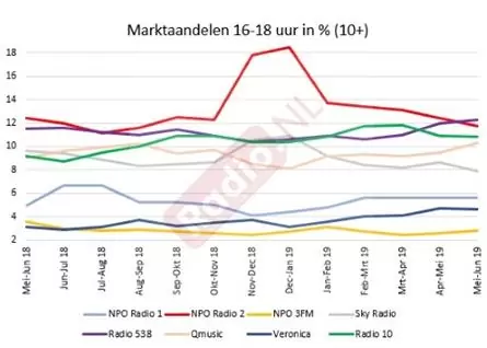 Radio 538 zag haar marktaandeel in dit tijdvak de afgelopen meting stijgen met 0,3%-punt naar 12,3% (mei-juni 2019, 10+).