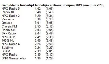 Het afgelopen jaar zagen vrijwel alle landelijke radiostations hun gemiddelde luistertijd met enkele minuten afnemen. Zo leverde Radio 2 vijf minuten in, 538 twee minuten en Qmusic zeven minuten. NPO Radio 4 daalde zelfs met 24 minuten. Classic FM verloor ook een kwartier.