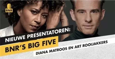 Art Rooijakkers en Diana Matroos gaan BNR’s Big Five presenteren. Ze nemen het stokje over van Roelof Hemmen, die stopt met zijn radiowerk voor BNR. Rooijakkers en Matroos gaan het programma op BNR bij toerbeurt (week op week af) presenteren.