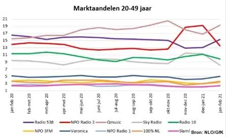 Ook Radio 538 herstelde zich van de feestdagen en steeg met 2,3%-punt naar 15,3%. Dit is wel 1,2%-punt lager dan een jaar geleden. NPO Radio 2 dook door het verdwijnen van het Top 2000-effect met 5,7%-punt naar beneden naar 13,5%, wat iets lager dan een jaar geleden is.