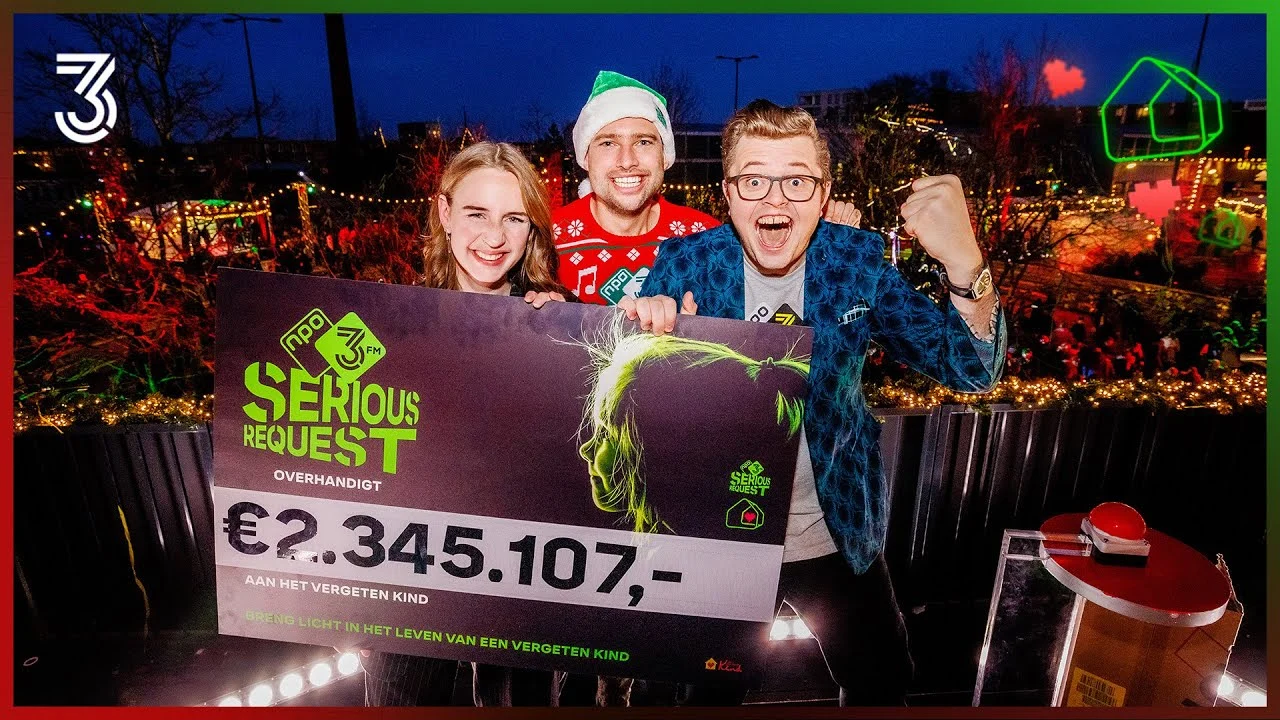NPO 3FM heeft zondag om 17.00 uur het (voorlopige) eindbedrag van Serious Request 2022 bekendgemaakt: 2.345.107 euro. De opbrengsten komen ten goede van stichting ‘Het Vergeten Kind’. Glazen Huis-bewoners Barend van Deelen, Sophie Hijlkema en Rob Janssen maakten het eindbedrag bekend op het dak van het Glazen Huis.