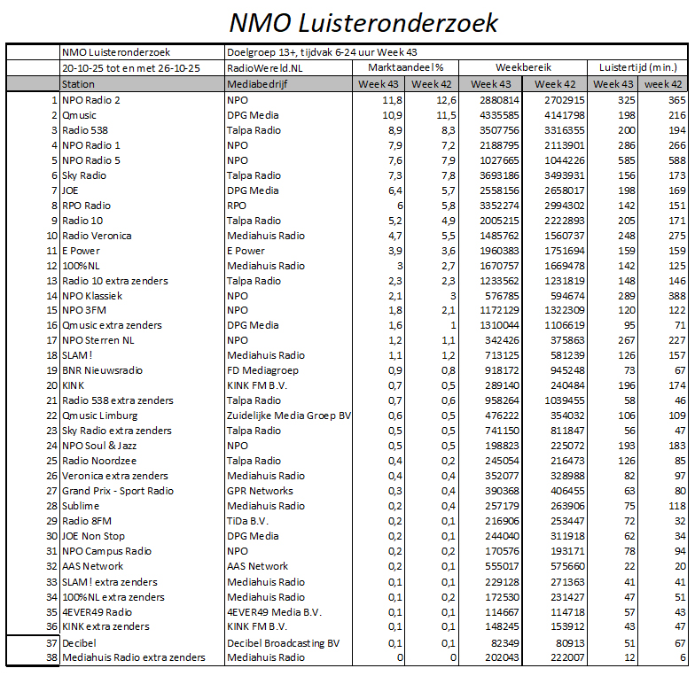 NPO Radio 2 was in week 43 van 2025 de best beluisterde radiozender van Nederland met een marktaandeel van 11,8%. Dit blijkt uit de nieuwe cijfers van het NMO Luisteronderzoek. Qmusic staat deze meting tweede met 10,9%, gevolgd door Radio 538 op de derde plaats met 8,9%.