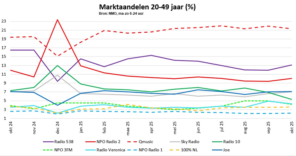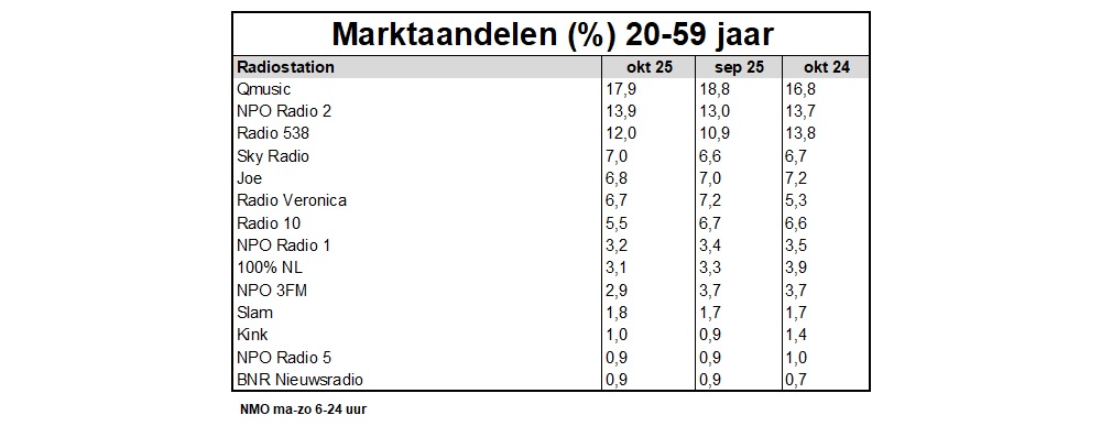 Bij de doelgroep 20-49 jaar domineerde Qmusic met 21,3% in oktober. Dit is 0,6%-punt lager dan in september, maar wel bijna 2%-punt hoger dan een jaar eerder. Mattie Valk en Marieke Elsinga noteerden in de ochtend 21,1%. Radio 538 volgt op ruime afstand met 13,1%, wat 1,2%-punt hoger is dan een maand eerder, maar wel een verlies van maar liefst 3,4%-punt ten opzichte van oktober 2024. De ochtendshow onder leiding van Tim Klijn was in oktober goed voor 16,1%.