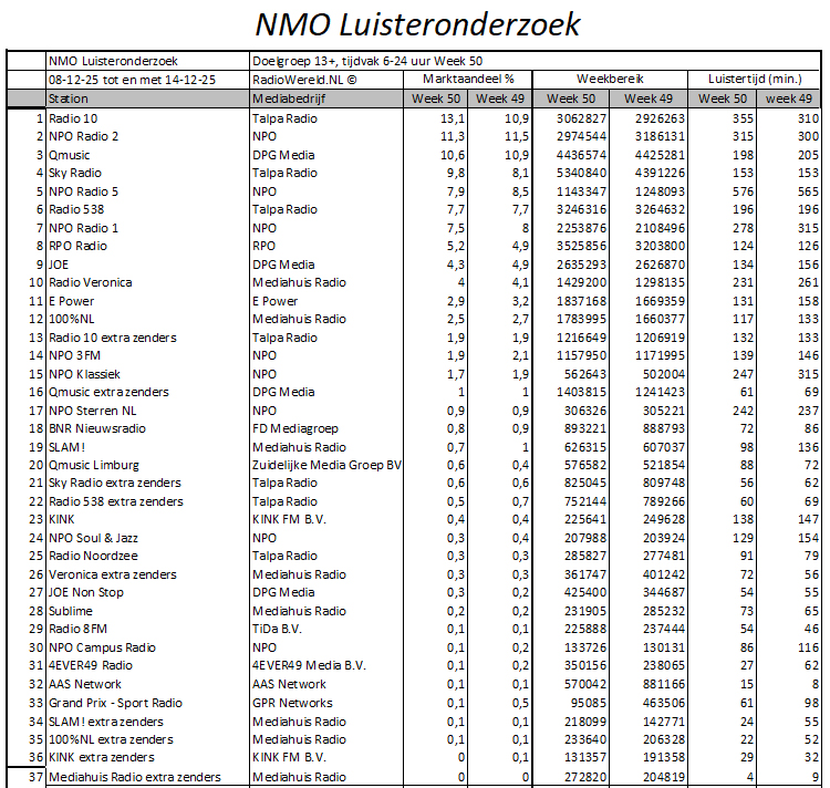 Radio 10 was in week 50 van 2025 de best beluisterde radiozender van Nederland met een marktaandeel van 13,1%. Dit blijkt uit de nieuwe cijfers van het NMO Luisteronderzoek. NPO Radio 2 staat deze meting tweede met 11,3%, gevolgd door Qmusic op de derde plaats met 10,6%.