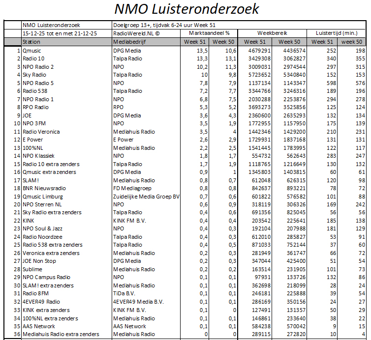 Qmusic was in week 51 van 2025 de best beluisterde radiozender van Nederland met een marktaandeel van 13,5%. Dit blijkt uit de nieuwe cijfers van het NMO Luisteronderzoek. Radio 10 staat deze meting tweede met 13,3%, gevolgd door NPO Radio 2 op de derde plaats met 10,2%.