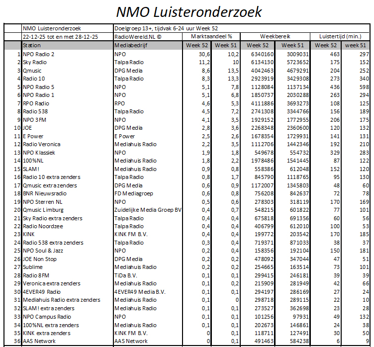 NPO Radio 2 was in week 52 van 2025 de best beluisterde radiozender van Nederland met een marktaandeel van 30,6%. Dit blijkt uit de nieuwe cijfers van het NMO Luisteronderzoek. Sky Radio staat deze meting tweede met 11,2%, gevolgd door Qmusic op de derde plaats met 8,6%.