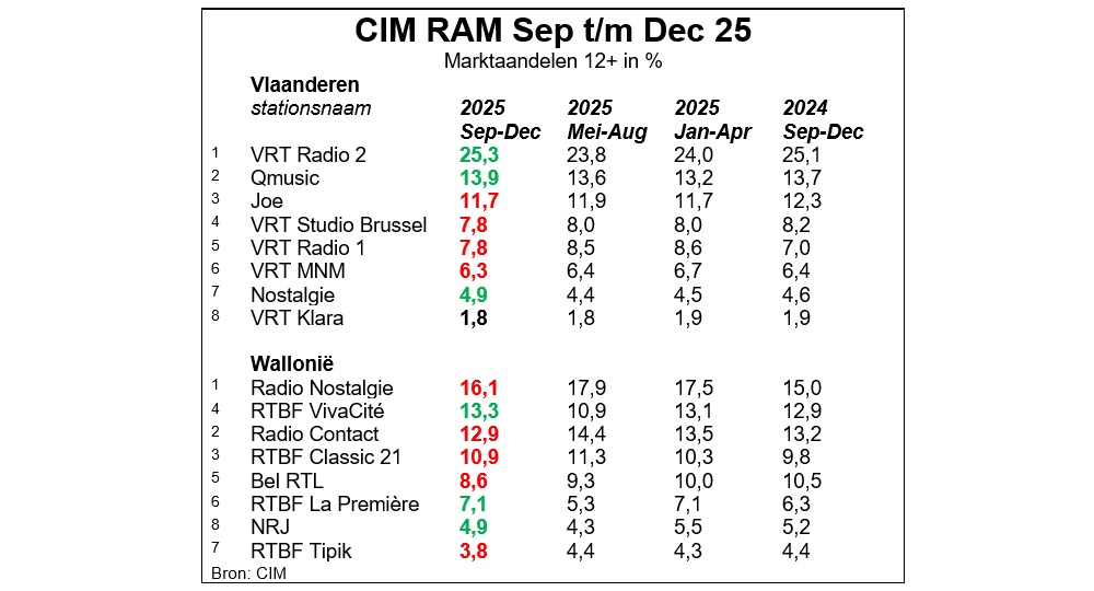 Woensdag verschenen voor de derde keer luistercijfers over 2025. In tegenstelling tot Nederland worden luistercijfers in België namelijk slechts drie keer per jaar gerapporteerd. De nieuwe CIM RAM luistercijfers bevatten gegevens van de periode september tot en met december.