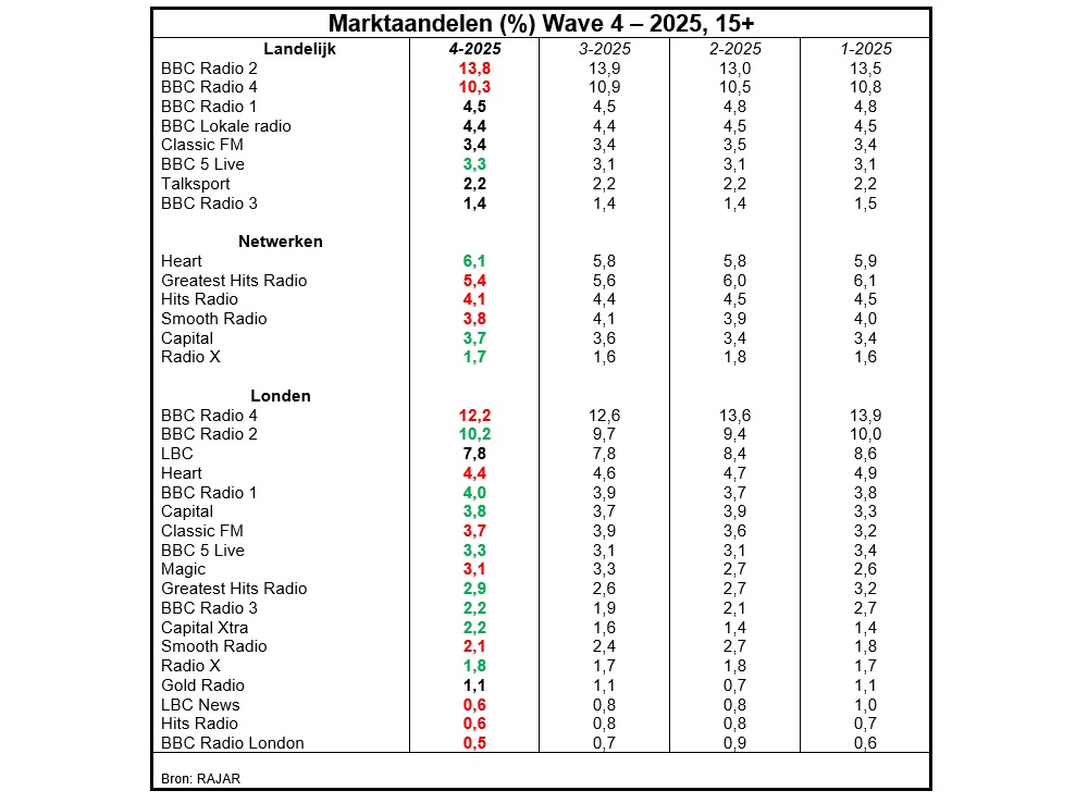 Het laatste netwerk dat de resterende lokale programma’s heeft geschrapt is Hits Radio in juni 2025. En dat is goed te zien in de cijfers, want opnieuw verliest het netwerk terrein. Zo daalde het marktaandeel het afgelopen kwartaal naar, terwijl ook het weekbereik met 2% daalde. Maar dat staat niet in verhouding met de aanzienlijke besparingen die eigenaar Bauer doet door het schrappen van de verschillende lokale programma’s.