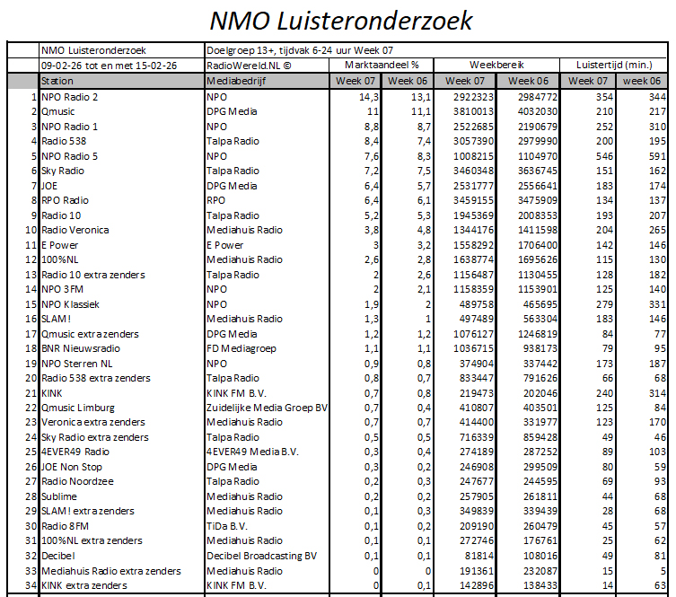 NPO Radio 2 was in week 07 van 2026 de best beluisterde radiozender van Nederland met een marktaandeel van 14,3%. Dit blijkt uit de nieuwe cijfers van het NMO Luisteronderzoek. Qmusic staat deze meting tweede met 11,0%, gevolgd door NPO Radio 1 op de derde plaats met 8,8%.